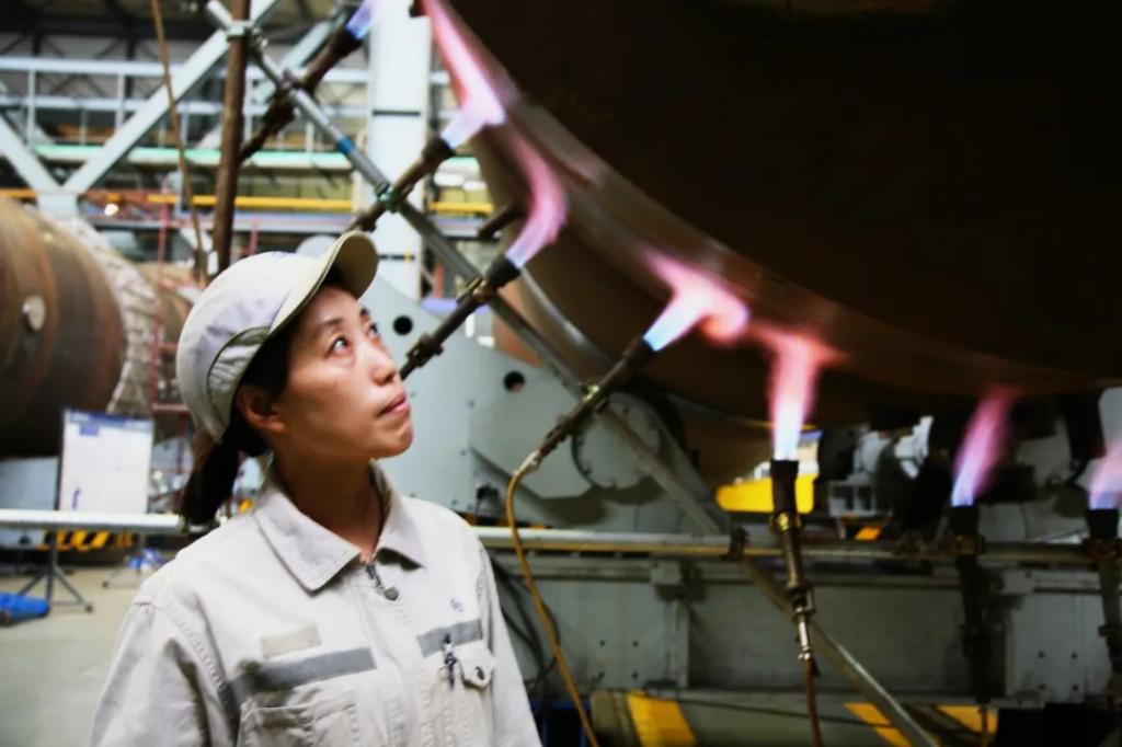 “焊后要清根,处理好坡口斜度、角度……”白映玉在课堂上进行技术交底、试板打磨装配、焊接。白天上班,晚上培训,节奏紧凑而不紧张,为获得稳定的焊接工艺参数和焊接质量打了坚实的理论基础。每一道焊缝,都是她对工作的热爱与对质量的承诺。当最后一丝焊花熄灭,她终于长舒一口气,脸上露出了疲惫却满足的笑容。在承制第一台AP1000蒸汽发生器管板管嘴低碳钢和镍基层堆焊时,返修后仍有缺陷,白映玉主动请缨独自承担第二次返修任务,带着一股子韧劲儿,一头扎进工位,琢磨缺陷产生的原因。在那个灯火通明的厂房里,夜幕已深,焊花映照出白映玉坚毅的身影,她正全神贯注地握紧手中的焊枪,汗水沿着她的额头滑落,却丝毫没有影响到她施焊的精准与稳定。焊接工序后,严格的检查与后热处理是不可或缺的一环,但时间紧迫,若当天无法完成,就意味着工件需要被送入加热炉中保温过夜,这不仅增加了能源消耗,还可能因温度波动影响焊接质量,更会造成工期的延误。
